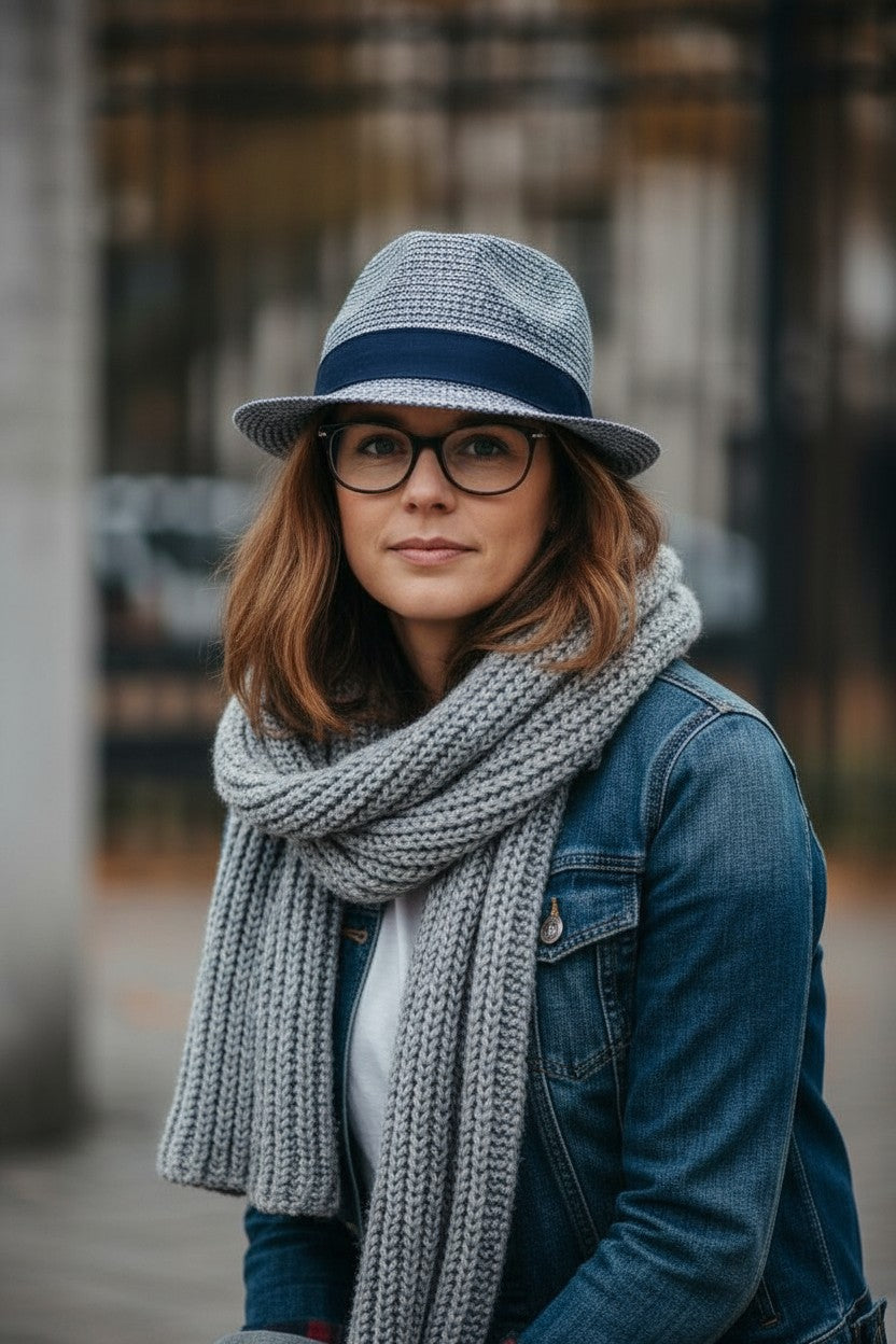 This lightweight navy-and-white marled straw fedora blends timeless shape with a modern two-tone weave for a refined, heathered look. Finished with a rich navy grosgrain ribbon and neat side bow, it adds effortless polish to any summer outfit.